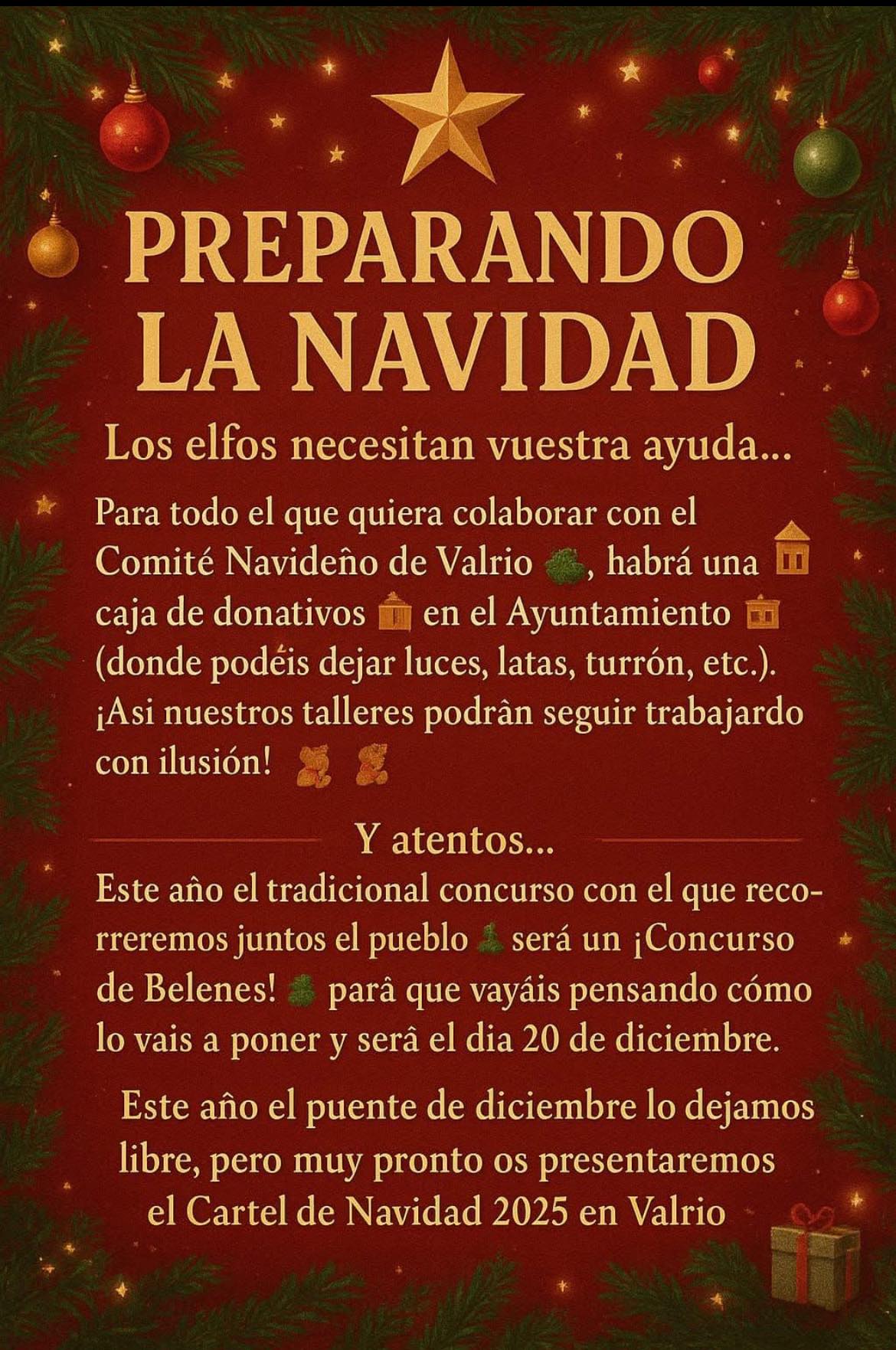 I CONCURSO DE BELENES VALRIO 2025 12 noviembre 2025 I CONCURSO DE BELENES VALRIO 2025 20 de Diciembre Valrio Si queréis colaborar con el Comité Navideño de Valrio pueden hacerlo a través del Ayuntamiento. Animamos a tod@s a participar